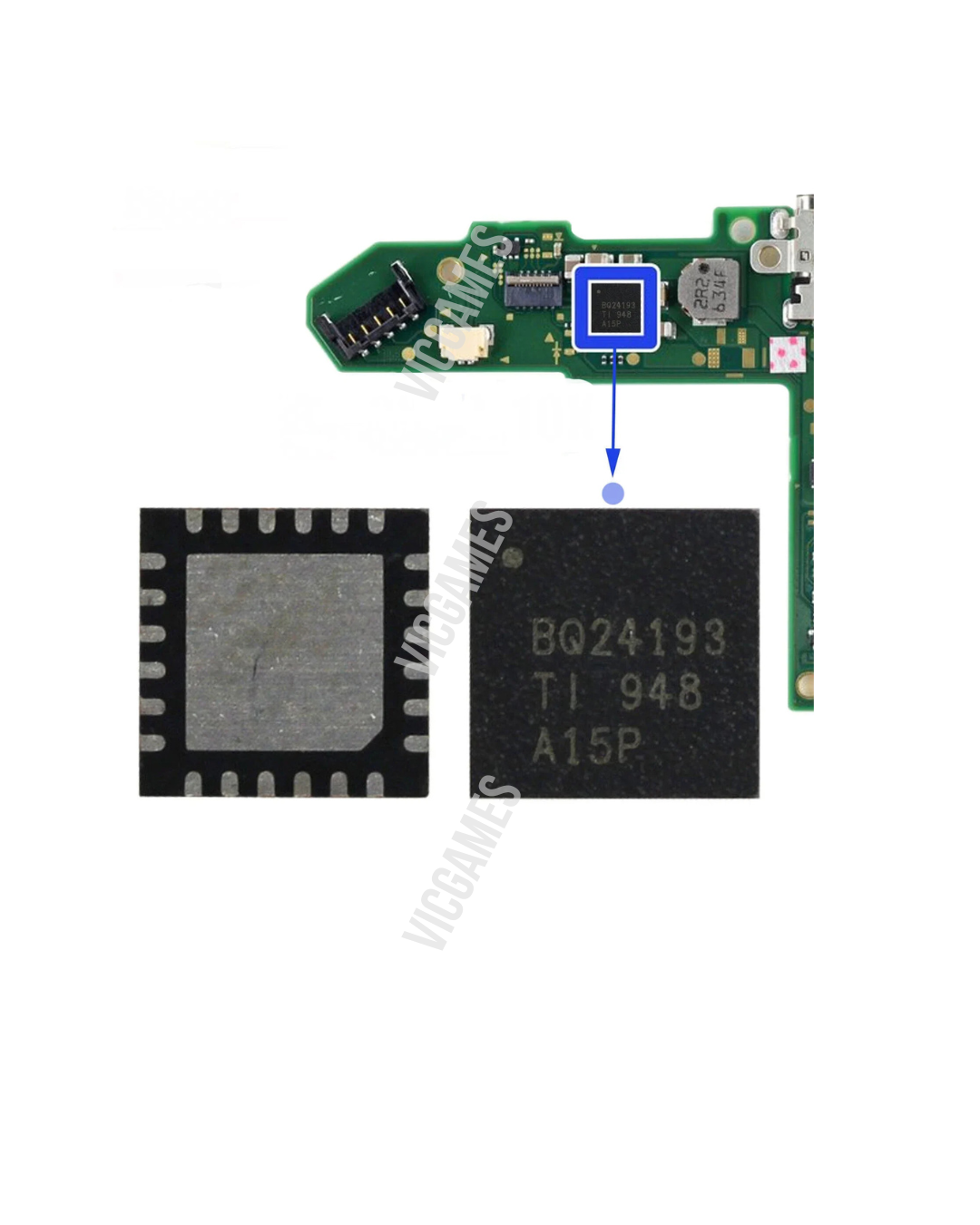 El BQ24193 es un chip IC especializado en la gestión de carga y alimentación de la batería en la placa madre de la Nintendo Switch. Es un componente clave para resolver problemas de carga lenta, sin carga o fallos de encendido relacionados con el sistema de energía.